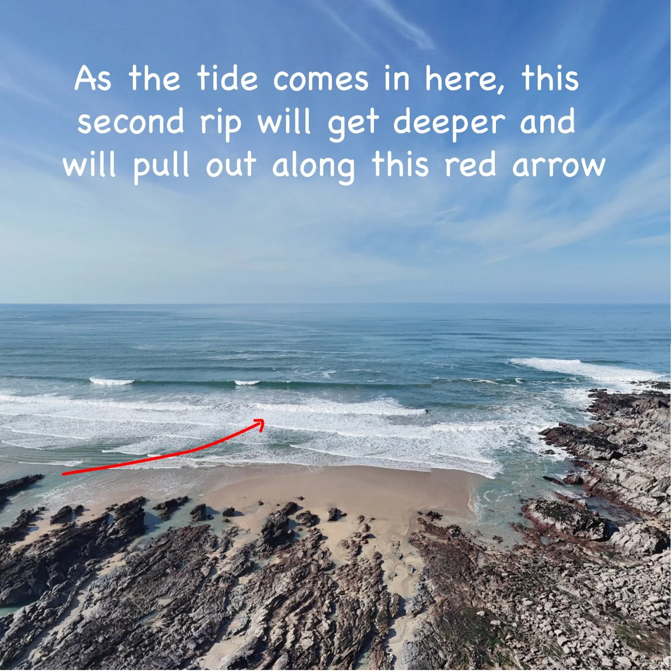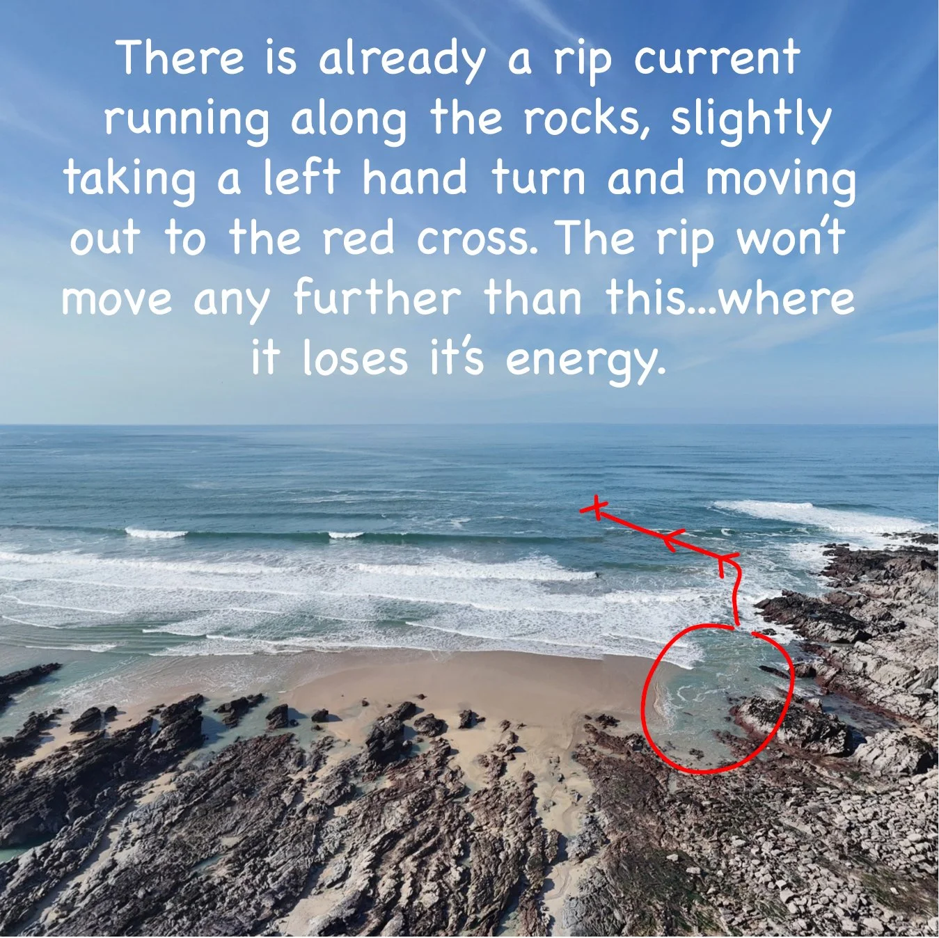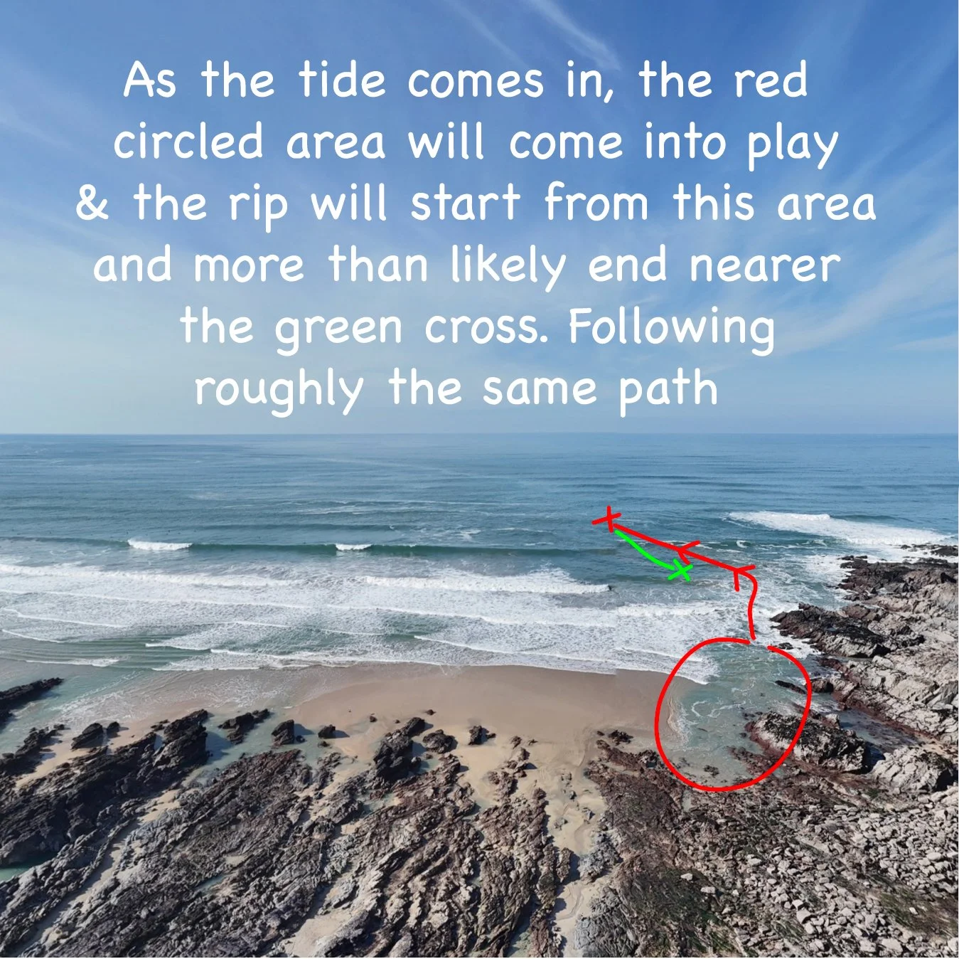 Here are a couple of examples of rip currents at Little Fistral. We’ve explained the scenario in the images.