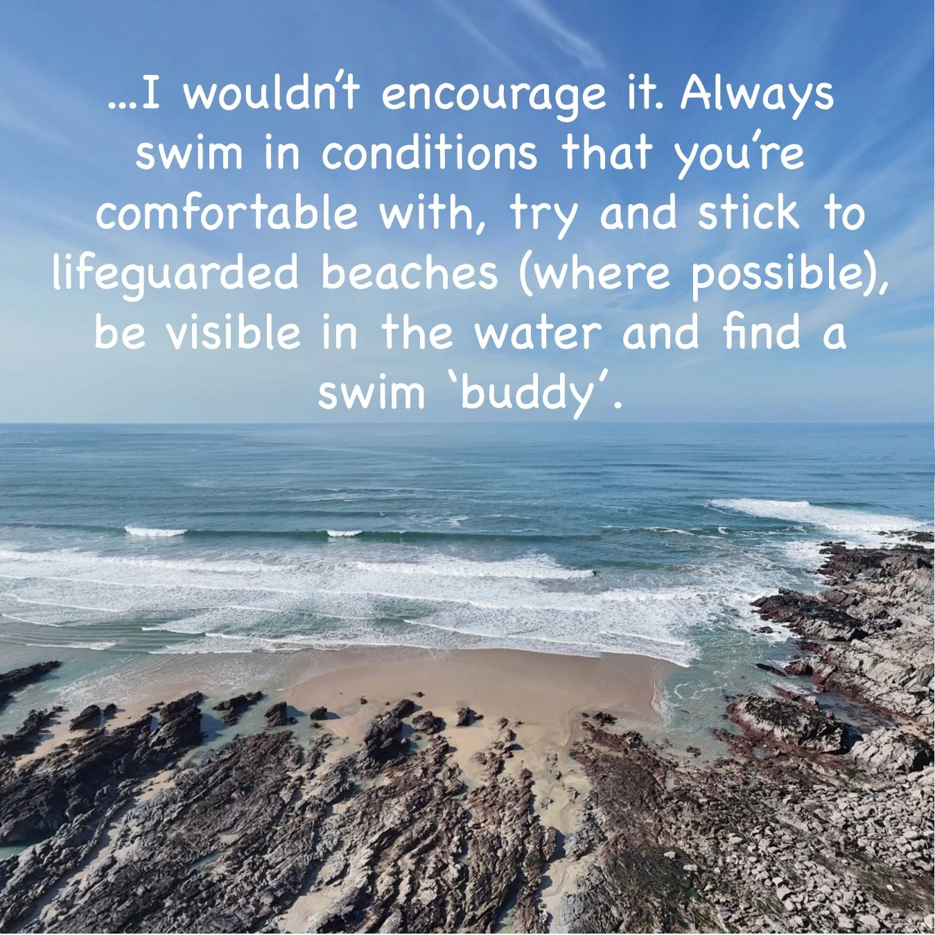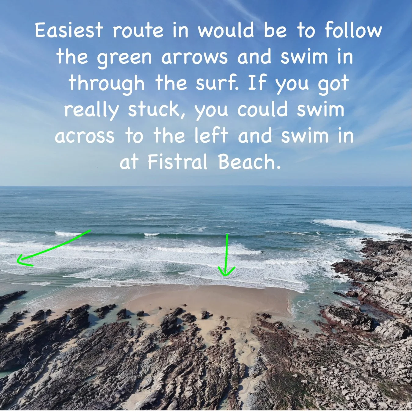 If you were to swim here, I think you’d definitely need a plan ie. Fistral Beach is just around the corner (to the left). If you did get stuck and couldn’t get back in, I’d simply and calmly swim across to the left, around the rocks between the two beaches and exit at Fistral. Fistral is also lifeguarded, so once you move across, you should be monitored pretty quickly. You wouldn’t swim around to the right, as its a large headland, you can get strong water movement around the point at various tide times and you’ll have fewer eyes on you…